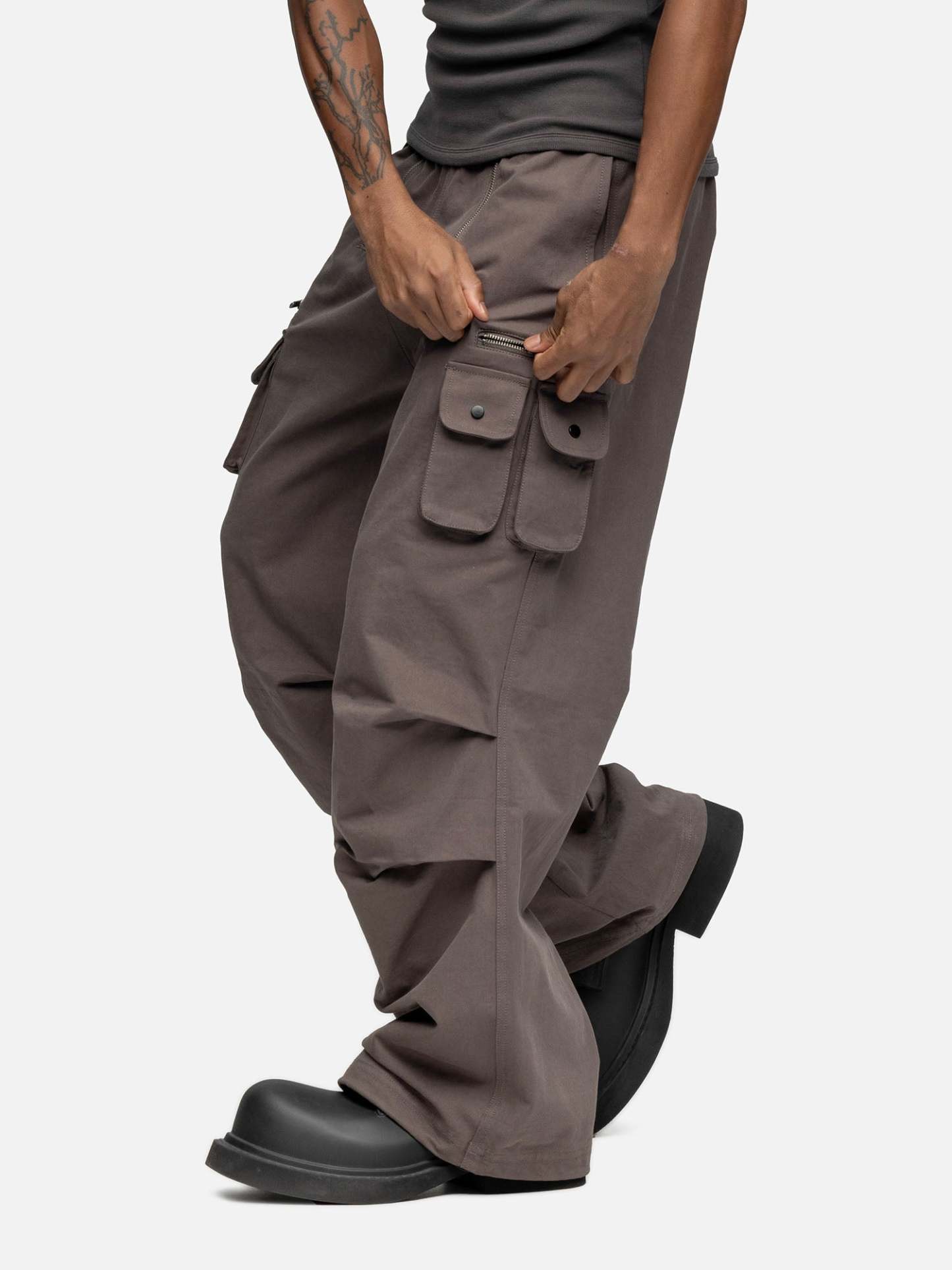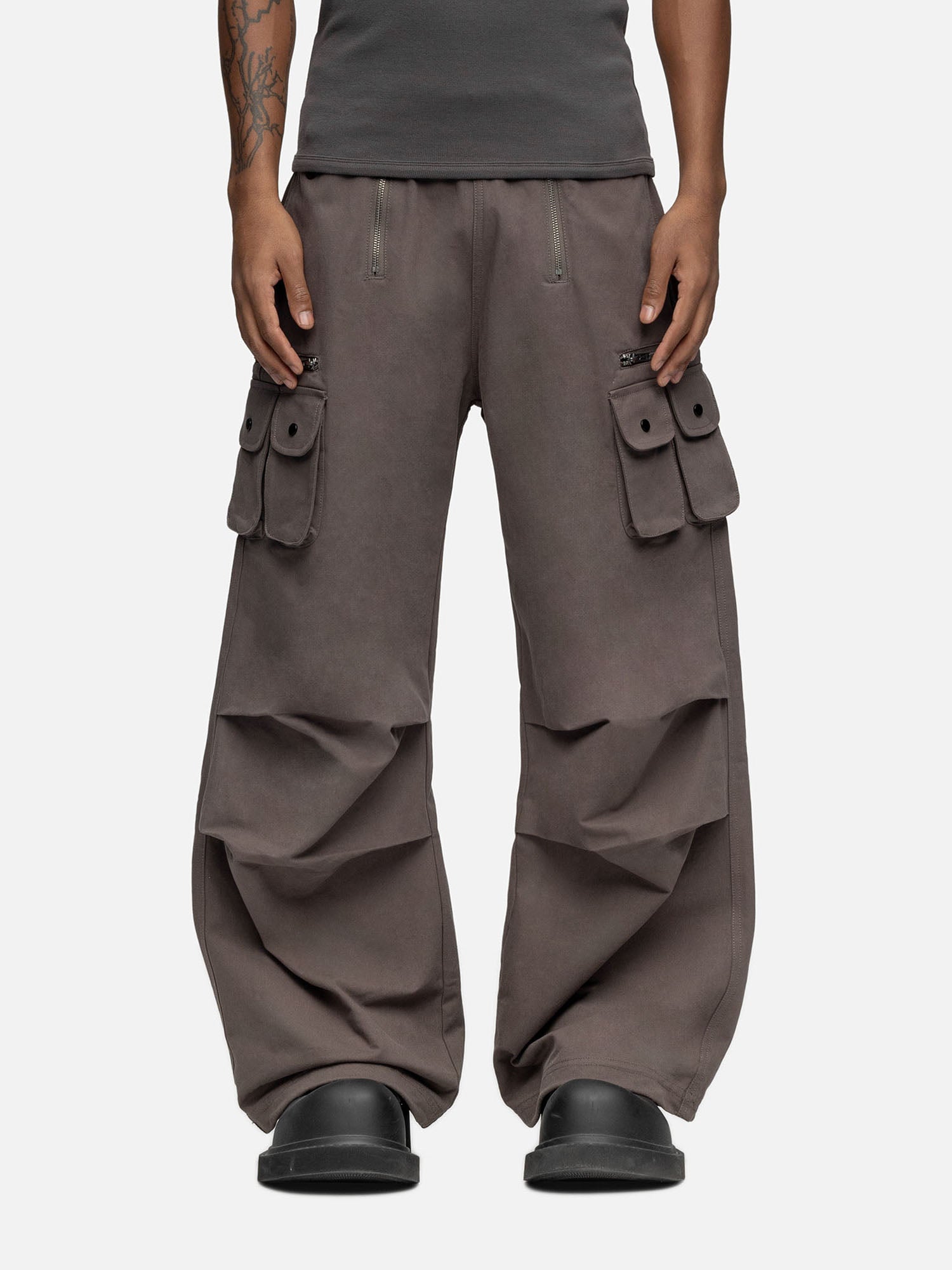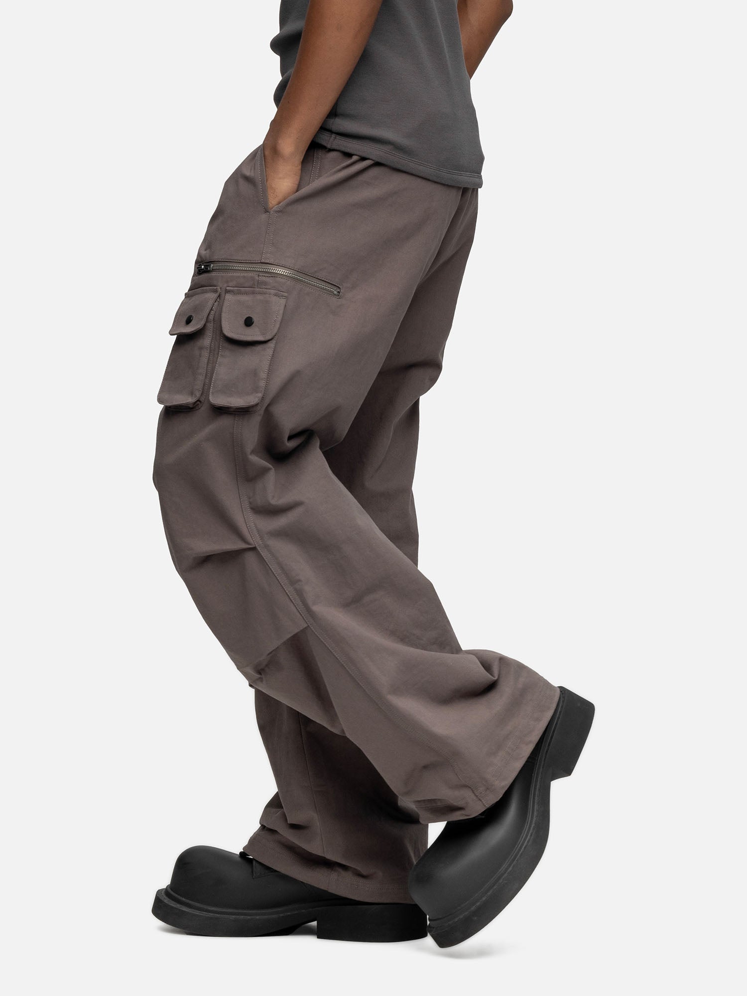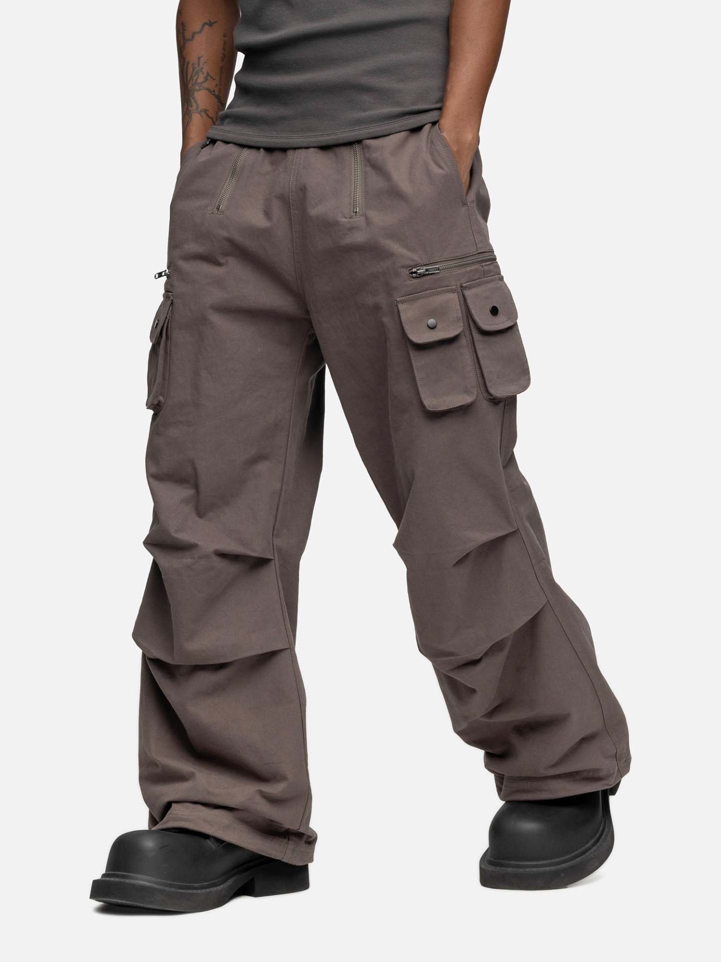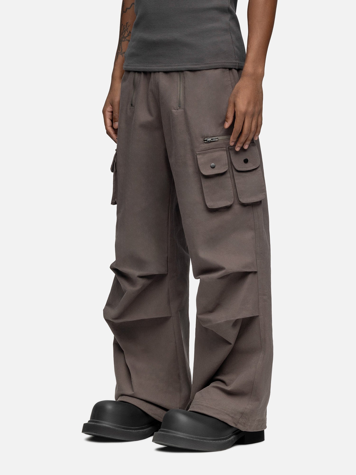 Crafted from cotton, the W5 Cargo features a double zipper opening, a buckle on the waist, front pockets, two boxed side pockets, and a zipper pocket on the side. Finishing off with pleats and drawstring leg opening.